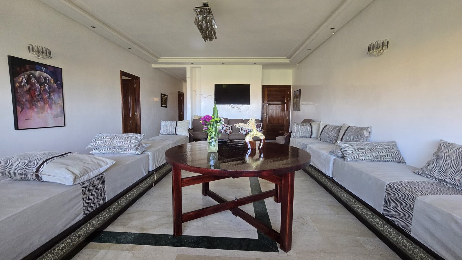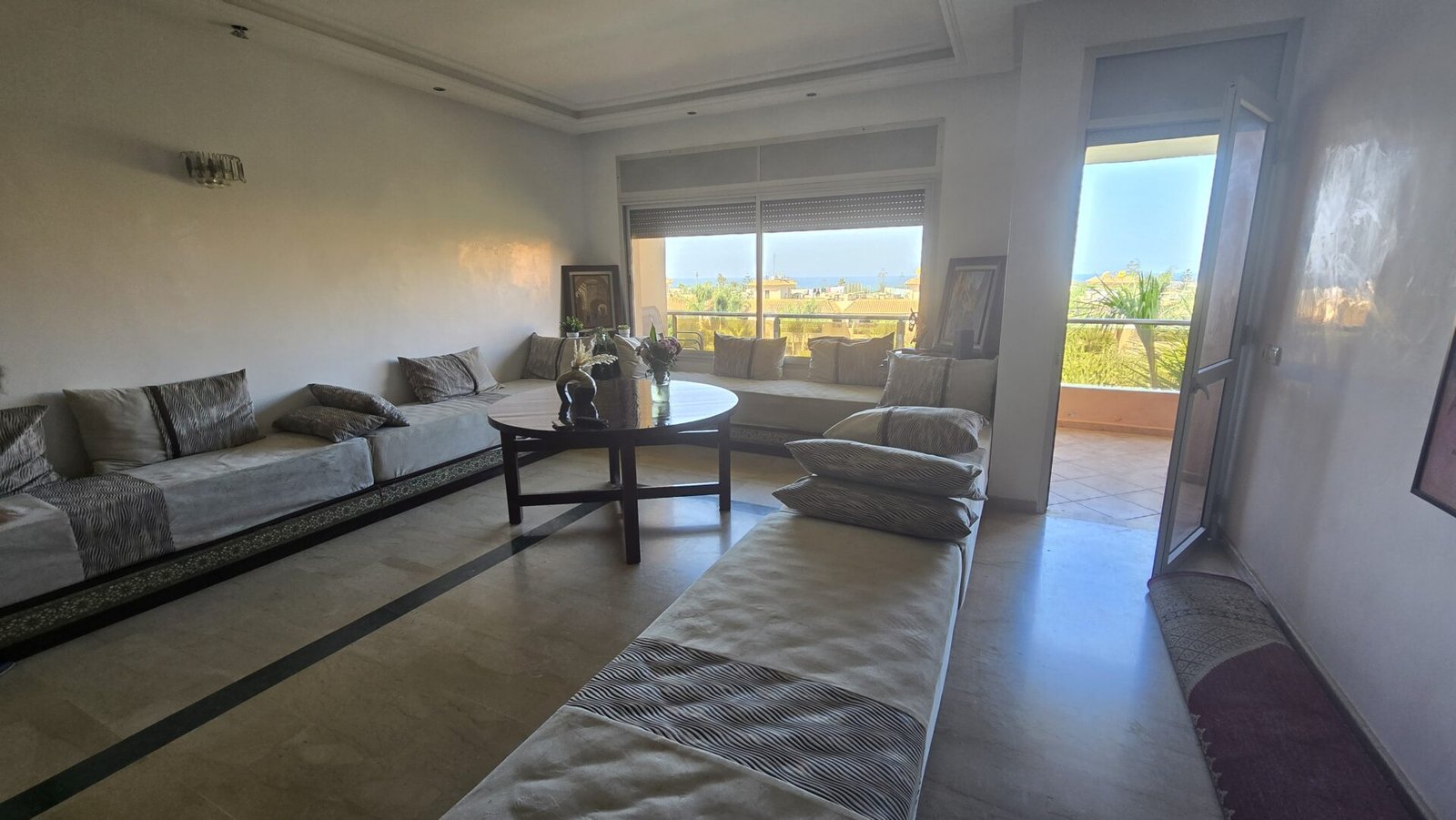 Découvrez ce magnifique appartement meublé, situé au 1er étage d’une résidence fermée, calme et hautement sécurisée à Harhoura.